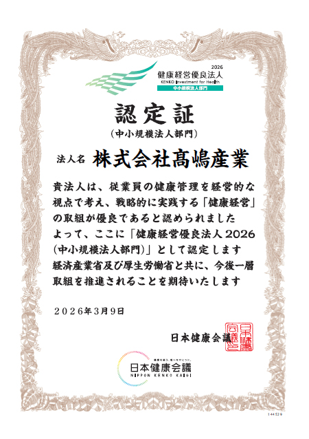 TAKASHIMA SANGYO TAKASHIMA SANGYO 表示月を選択 2026年3月 (1) 2023年3月 (1) 2026年03月 健康経営優良法人に認定されました。 2026.3.31 健康経営優良法人より、「健康経営優良法人2026(中小規模法人部門)」で株式会社高嶋産業が認定されました。 « 前へ一覧 最新情報すべて見る 2026.3.31健康経営優良法人に認定されました。 2023.3.14(株)髙嶋産業HP開設 採用情報すべて見る 2023.3.15正社員募集!